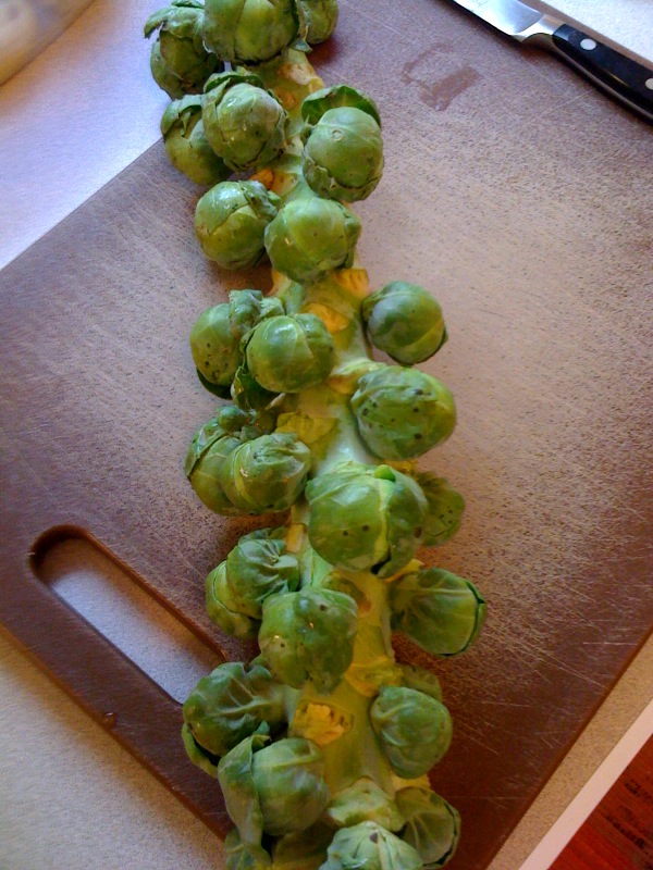 I never knew what brussel sprouts looked like growing on the stalk. What a treat to discover that last week’s CSA included them on the stalk…right in time for the big Thanksgiving meal! Prepping them for this dish was so simple – just snap them off the stalk, no need to cut the off the ends of each brussel sprout.