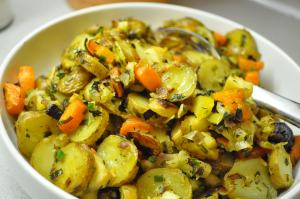 - Combine potatoes through olive oil in a 9X13″ baking dish. Bake at 425 F for 30-45 minutes, stirring every 10 minutes, or until vegetables are tender and potatoes are golden brown.