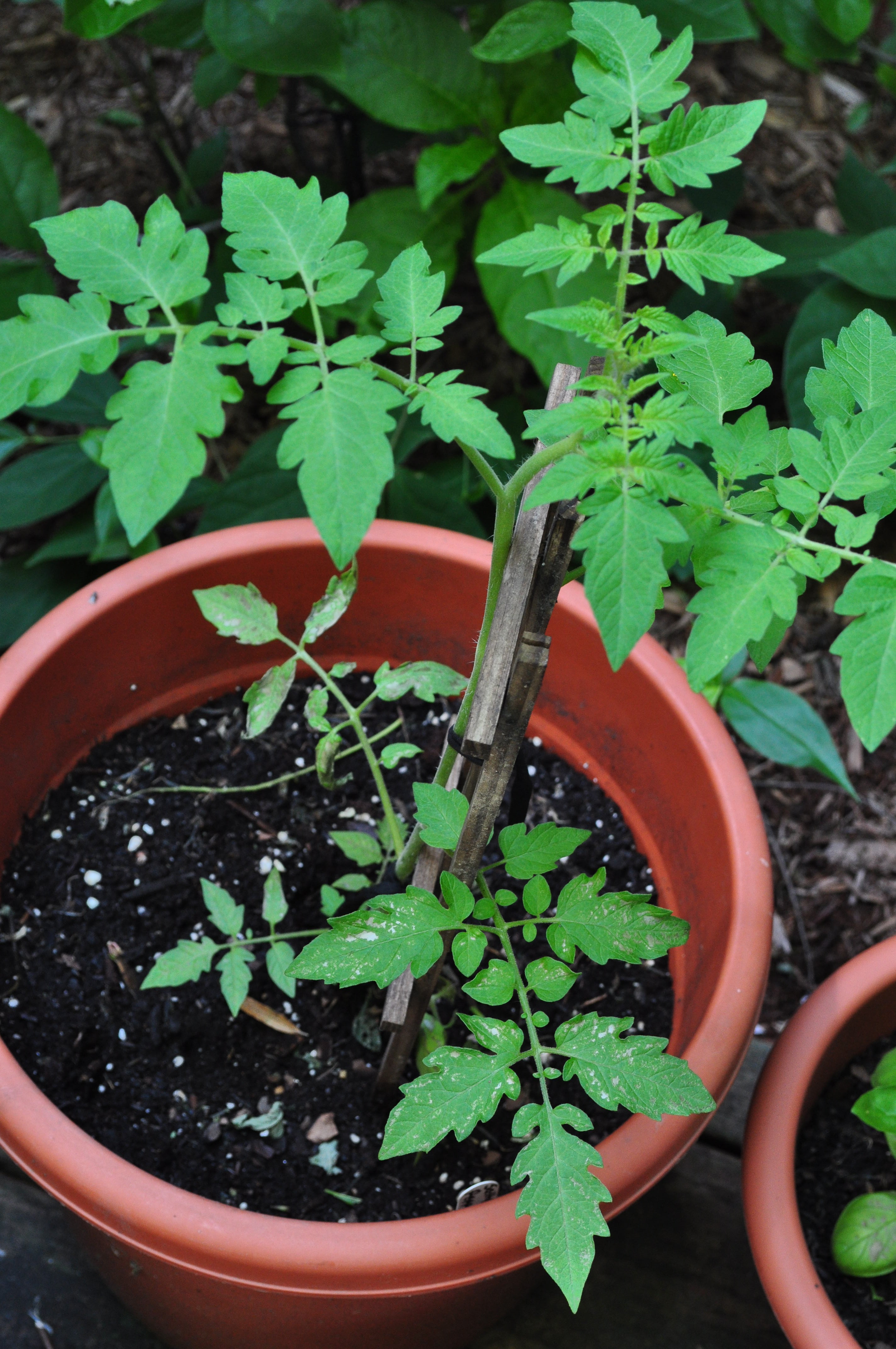 Sadly, my community garden plot days are over. My husband and I moved to Washington DC at the end of 2008. We quickly learned that community garden plots are in high demand, and there just isn’t enough of them to meet this demand. We tried to get a plot at the Kalorama Heights Community Garden. Although we live only a 5 minute walk from the garden and they had a couple of openings, as Adams Morgan residents we are out of the “catchment” zone. Perhaps these plots are meant only for those wealthy enough to live in Kalorama Heights. Well, after giving up on getting a community garden plot and being inspired by my friend and co-worker, John (the mastermind behind Grown in the City), I decided to take advantage of my patio and plant a few tomato plants and herbs in flower pots. While we do not get the best light (we’re on the north side of the building), the plants are flourishing.