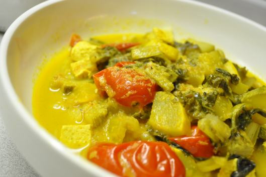 - In a large heavy casserole heat oil over medium heat. Add onion/ginger paste and cook, stirring, 1 minute. Add curry powder and cook, stirring, 1 minute. Add coconut milk through squash. Increase heat to medium-high and bring to a soft boil. Reduce heat to low, cover and simmer for 5 minutes. Add tofu through swiss chard and simmer, cover and simmer for an additional 1o minutes until all vegetables are tender and tomatoes are wilted. Discard jalapeno, cinnamon stick, and clove.