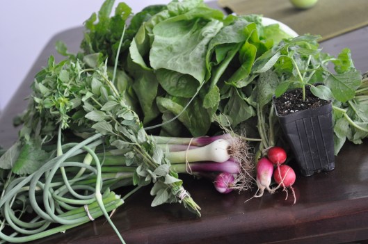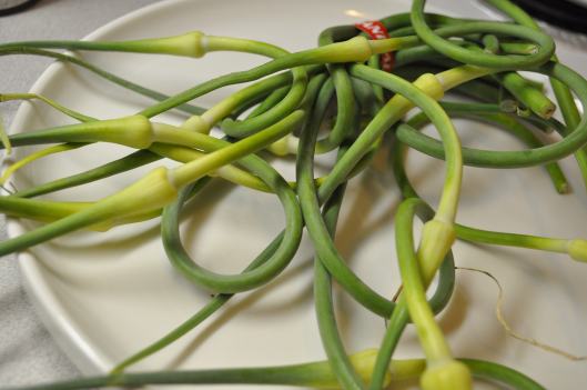 Well, it’s finally here! The Licking Creek Bend CSA. This is my first time with the spring CSA, and it turns out you DO get a lot of greens. But I also got a nice basil plant that is doing well in my garden. I also got a bunch of garlic scapes, which I’ve never tried before, but adored. I made white bean and garlic scape dip (5 ingredients – a can of white beans, scapes, olive oil, salt and pepper!) and roased scapes along with my roast chicken.