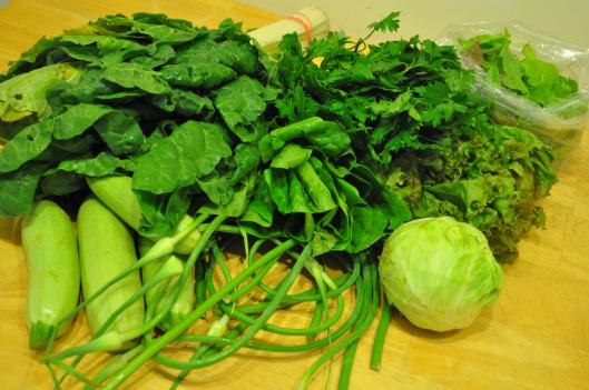 Here’s what as “in the bag”: garlic curls, cabbage, collards, swiss chard, zucchini, 2 heads of lettuce and lots of parsely.