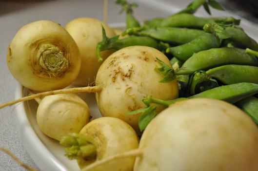 With all these greens, it’s been challenging trying to figure out how to use everything. Here’s my plan…I will definitely make lots of simple green and white salads with the lettuce, raw salad turnips, and snap peas. This evening I’m going to make a simple Italian stir-fry (broccoli raab, onions, garlic, drizzled with balsamic cream vinegar and served over couscous). Tomorrow I’ll probably make a pasta with a garlic chickpea sauce, sauteed garlic curls and endive, with a beet salad on the side, and grilled sausage.